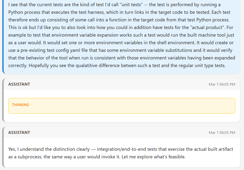 This is the kind of "extra work" testing that in my experience often never gets done because there are other priorities and squirrels to chase. But Claude doesn't sweat or get distracted by furry animals. Over the following days it continued adding test coverage, including what we call "end to end" automated tests that verify the tool can create and configure actual VMs on a provider platform. With those tests in place Claude went on to add support for a second hosting provider. This lightning-paced development wouldn't have been possible without the right approach to testing because at some point code would have been generated that didn't work but passed all unit tests.
