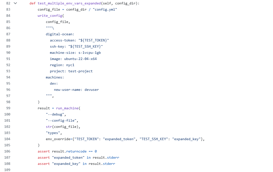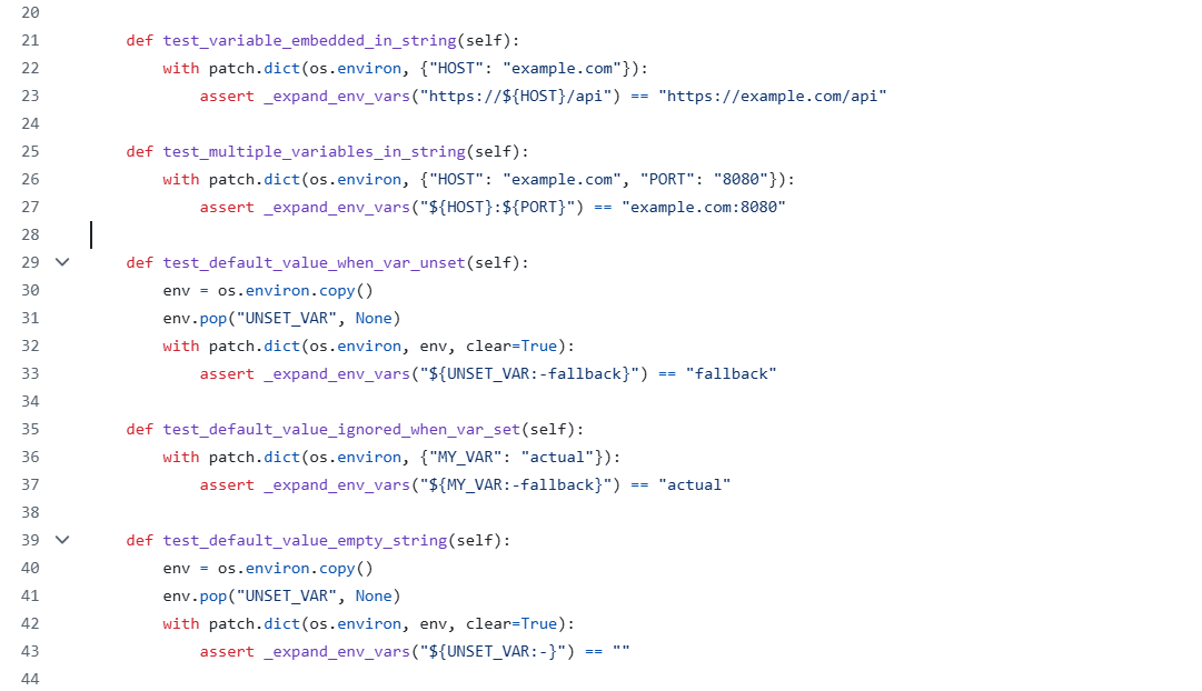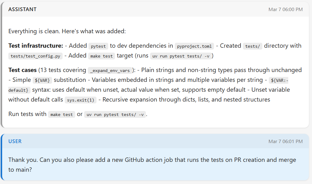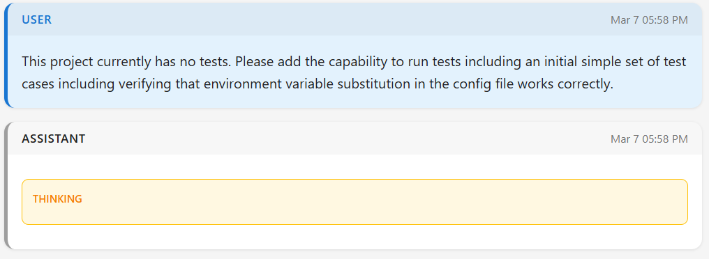 Claude's first feature implemented environment variable expansion in configuration files (handy to avoid exposed credentials). After the PR was merged the prompt below asked Claude to add testing to the project, and in particular to test that new feature:
